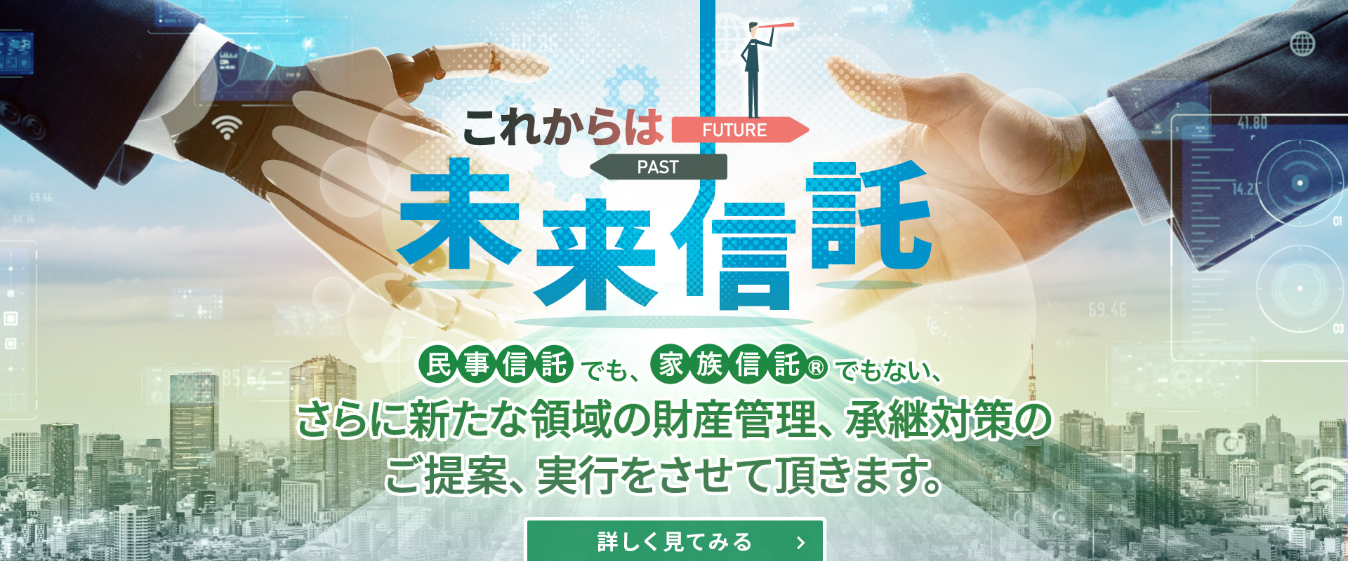 「未来信託」とは、「貴方の財産」の未来(将来)は、貴方自身の「想い」や「願い」によって、誰でもない貴方自身が決めておく、新しいオトナの責任ある嗜みです。